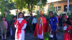 RCLM Baucau (29/03/2026)—Bispu Diocese Baucau Dom Leandro Maria Alves iha misa Domingu Ramus Hateten, tama iha semana santa sarani sira presija husik hahalok aat sira,…