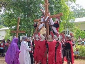 RCLM Baucau (03/04/2026)—Sarani katólika husi Jona Fatumaka hamutuk ho Kaben Na’in ba Kristu (KBK) Soldadu ba Kristu ADMA, inklui organizasaun THS-THM selebra Sesta-Feira Santa ho viasakra moris, husi estasaun ida to’o sanolu resin ha’at hodi refeleta Jesus Kristu nia terus no mate iha kruz.